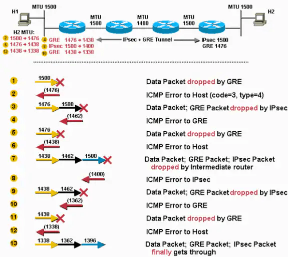 The sending host uses a 1476-byte packet size when it resends the data. The GRE router adds 24 bytes of GRE encapsulation and ships out a 1500-byte packet.