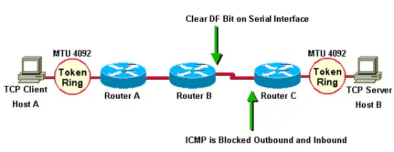 In the next scenario, Router A and Router B are in the same administrative domain. Router C is inaccessible and blocks ICMP, so PMTUD is broken. A workaround for this situation is to clear the DF bit in both directions on Router B in order to allow fragmentation. This can be done with policy routing. The syntax to clear the DF bit is available in Cisco IOS® Software Release 12.1(6) and later.