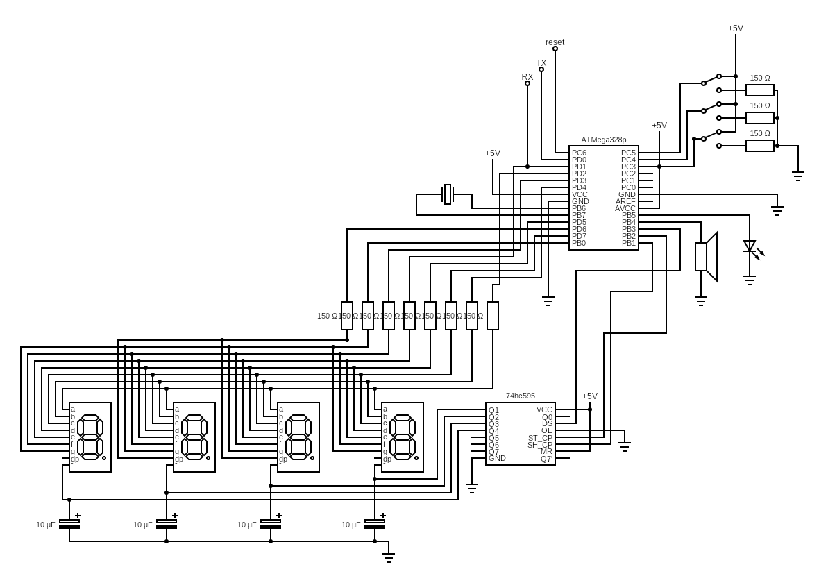 Соединим конденсаторы и семисегментный индикатор с сдвиговым регистром 74ch595.