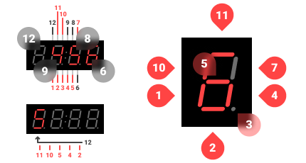 Это странная шутка, но работает очень просто, каждый разряд имеет 8 сегментов, у каждого разряда есть минус и восемь плюсов, по сути это те же светодиоды, только в общем корпусе.