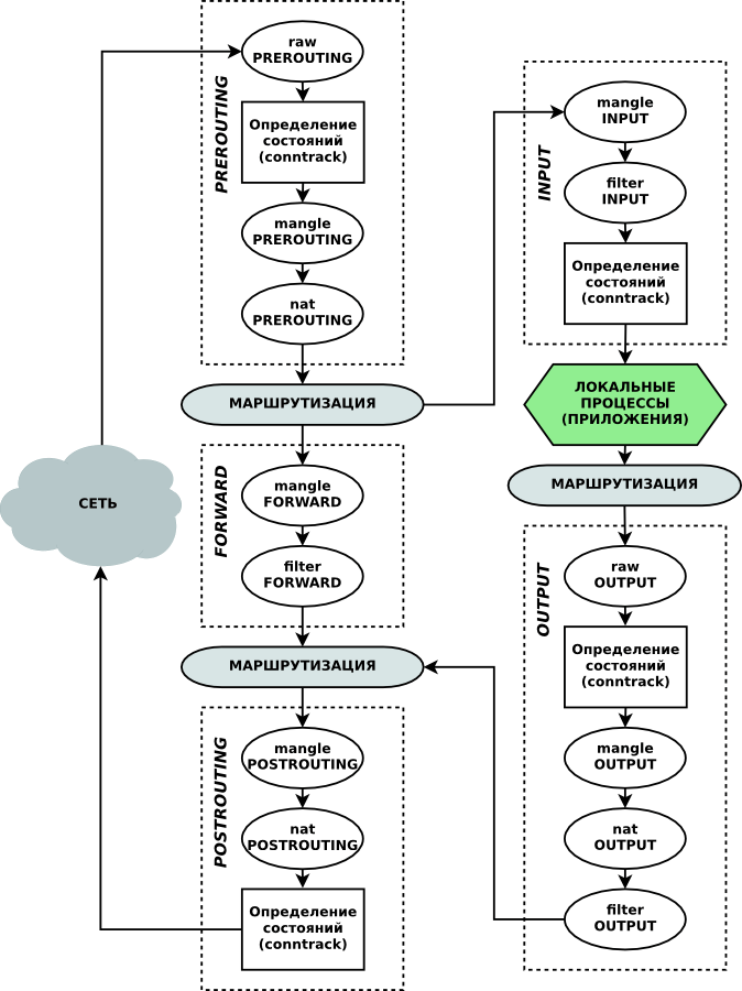 Вспомним путь прохождения внешнего пакета в правилах iptables, сверху вниз: