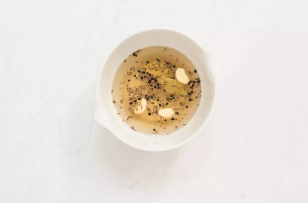 3. К подготовленному маринаду (шаг 2) добавьте лавровые листья, цельные семена тмина, перец горошком и 3 целых очищенных зубчика чеснока. Маринад для яиц готов.