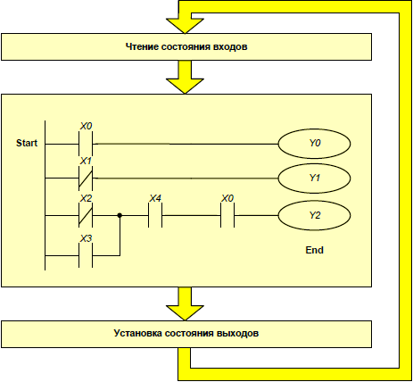 В контроллере, по сути, происходит эмуляция работы релейной схемы. А схема эта описывается программой, которая загружается в контроллер. В реальной релейно-контактной электрической схеме все задаваемые управляющие процессы выполняются одновременно (параллельно). Каждое изменение состояние входных сигналов сразу же действует на изменение состояния выходных сигналов.