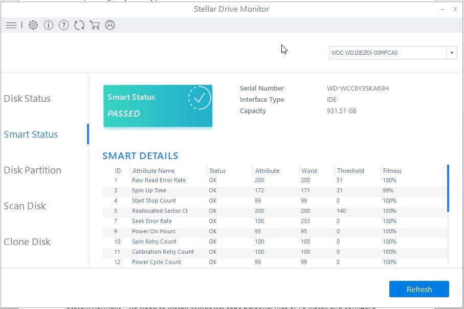 Stellar Data Recovery Premium is a complete data care utility that recovers lost data, repairs corrupt files, and prevents future data loss. Plus, the SMART disk monitoring tool embedded within the software actively monitors the SMART status of your drive. The tool displays the drive health condition, performance rate, and current temperature based on the SMART parameter inputs.