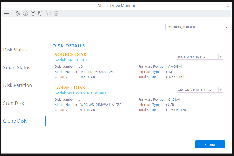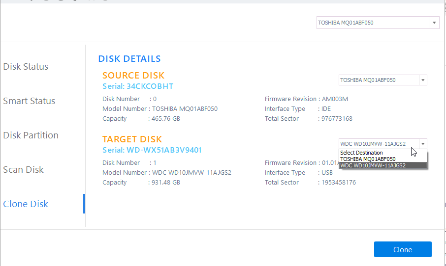 6. Check that you have selected correct disk in both Source and Target. Once confirmed, click ‘Clone’ and accept the Warning message.