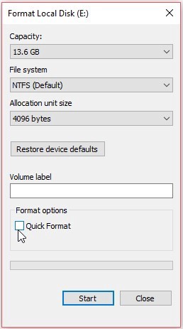 Disable’ Quick Format’ checkbox to ‘Full Format’ Disk