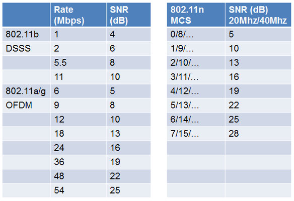 [3.1] Уже несколько раз мы упоминали скорости (rate/MCS — не throughput) в связке с SNR. Ниже приведена таблица необходимых SNR для рейтов/MCS, составленная мной по материалам стандарта. Собственно, именно поэтому для более высоких скоростей чувствительность приемника меньше, как мы заметили в [1.1].