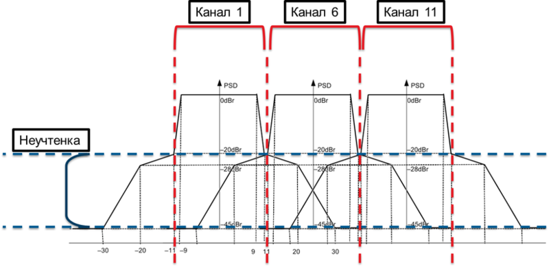 [2.1] Все считают, что ширина канала — 22МГц (так и есть). Но, как показывает иллюстрация, сигнал на этом не заканчивается, и даже "непересекающиеся" каналы таки перекрываются: 1/6 и 6/11 — на ~-20dBr, 1/11 — на ~-36dBr, 1/13 — на -45dBr.