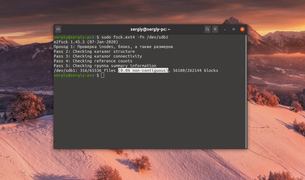$ sudo e4defrag /dev/sdb1Дальше можно снова проверить фрагментацию. Отмонтируйте перед этим раздел. Фрагментация 0%: