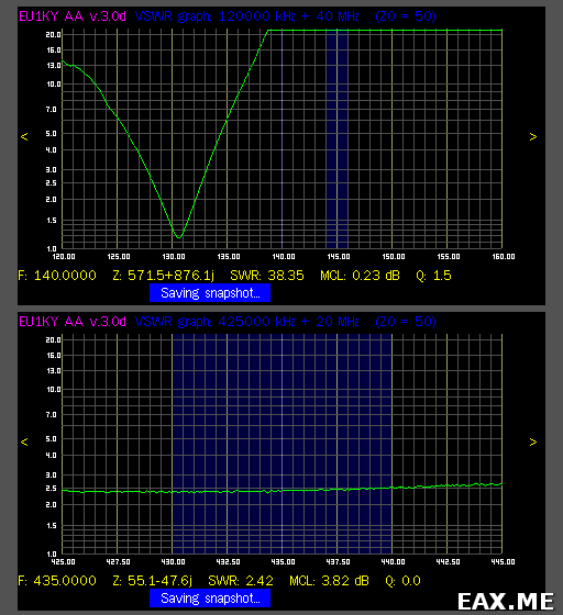 При построении таких графиков необходимо держаться за корпус антенного анализатора. Дело в том, что для нормальной работы антенне нужно человеческое тело, выполняющее роль противовеса. Если не держаться за корпус, графики получатся еще хуже. Как видите, резонанс немножечко промазал на двойке, всего-то на «какие-то» 15 МГц, а на 70 см КСВ не опускается ниже 2.4. В общем, антенна скверная.
