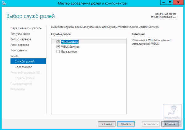 Следующим шагом переходим к базовым настройкам служб роли. В нашем случае потребуется выбрать опции WID Database и WSUS Services, если вы собираетесь использовать SQL-сервер, то вместо WID Database следует выбрать опцию База данных. Сам сервер баз данных к этому моменту уже должен быть развернут в вашей сети.