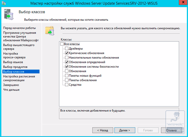 На следующей странице укажите какие классы обновлений вы хотели бы получать, здесь все зависит от политики обновлений на вашем предприятии. Следует помнить, что обновления драйверов и пакеты новых функций крайне не рекомендуется разворачивать автоматически, без предварительного тестирования. Если у вас нет возможности этим заниматься, то указывать эти классы вам ни к чему.