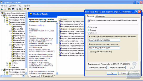 Или в локальных политиках: Пуск - Выполнить - gpedit.msc, затем Конфигурация компьютера - Административные шаблоны - Центр обновления Windows (Windows Update)- Указать размещение службы обновлений Microsoft в интрасети.
