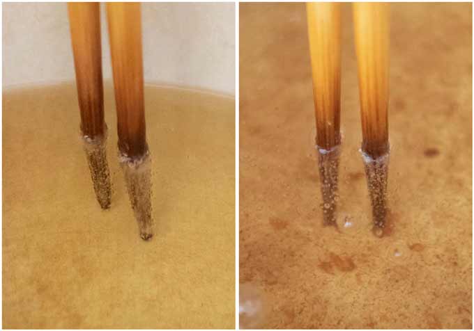 If you have a kitchen thermometer, that will be great. If you don’t, dip a pair of bamboo chopsticks in the oil and check the approximate temperature. If tiny bubbles are quietly forming around the chopsticks, then it is about 160-165°C/320-329°F, if larger bubbles are quickly rising, it is 180-190°C/356-374°F. You might find it difficult to see the difference in the comparison photo below, but hopefully you can see larger bubbles are coming up in the right photo.