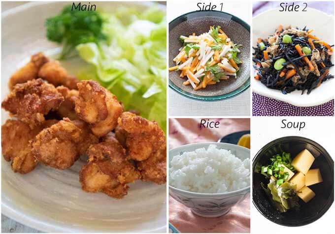 A typical Japanese meal consists of a main dish, a couple of side dishes, a soup and rice. I try to come up with a combination of dishes with a variety of flavours, colours, textures and make-ahead dishes.