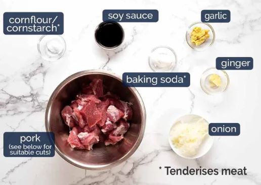For thin strips used in stir fries (as per the velveting chicken and beef directions), I use more baking soda to meat weight, marinate barely (20 – 40 min), then rinse it off before cooking. This won’t work for Sweet & Sour Pork because it would over tenderise the outside before the inside is tenderised because the pieces are chunkier. In this recipe, we use less baking soda, marinate for longer and do not rinse off – this tenderises the pork more evenly;