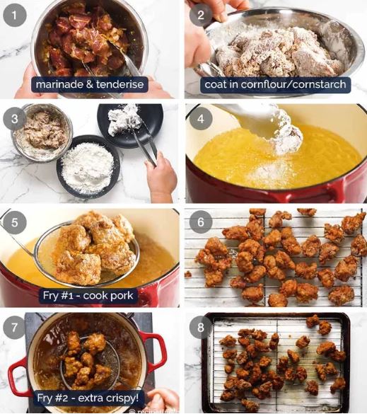 1. Pork - pork scotch (aka pork neck / collar butt) and pork shoulder/butt are recommended for best flavour and juiciest pork pieces. Usually requires slow cooking to make them tender - the baking soda and cornflour in the marinade is a Chinese tenderising secret - also see how to tenderise Chicken and Beef. This juicy cut means we can cook for a bit longer to get the outside super crispy without the inside becoming dry and tough.