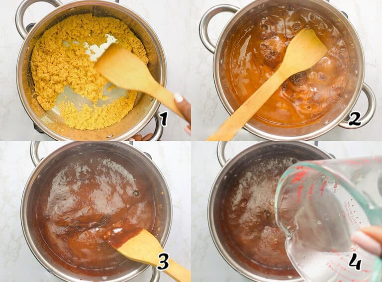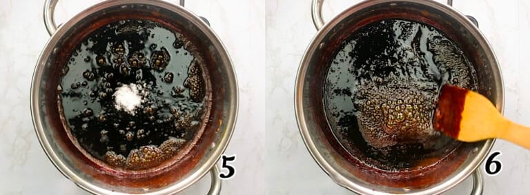 Caramelize Sugar – Heat a small pot over low heat. Add brown sugar and stir until it melts. (Photos 1-3)