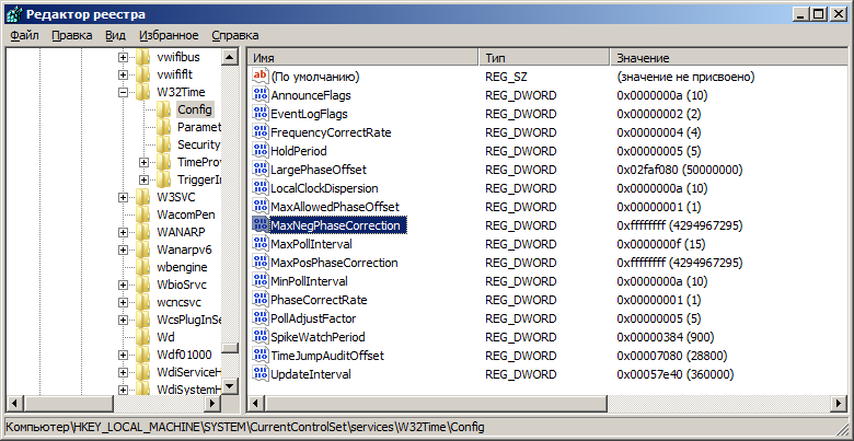 Поэтому, для надежной синхронизации часов компьютера с сервером времени в Интернет, независимо от их текущих показаний, желательно увеличить абсолютное значение параметров MaxNegPhaseCorrection и MaxPosPhaseCorrection, или вообще задать им максимальное значение для типа DWORD – 0xffffffff или 4294967295.
