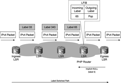 The use of implicit NULL at the end of an LSP is called penultimate hop popping (PHP). The LFIB entry for the LSP on the PHP router shows a "Pop Label" as the outgoing label. Figure 3-3 shows penultimate hop popping.