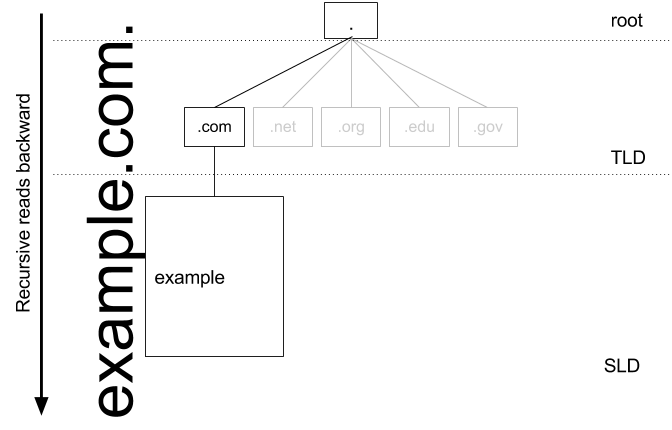 Root is the first place where a recursive DNS server goes looking for information about an address that it doesn’t hold in its cache. An address, say example.com., looks like .com.example to a machine. We read example.com from left to right, but the DNS actually does it backwards and starts with that dot. The trailing dot is typically dropped from the end of an address, it’s rarely seen to even the most eagle-eyed of Internet users.