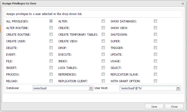 5. Assign the correct privileges for owncloud db user on database owncloud: