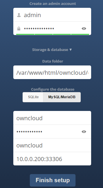 6. Open the browser and navigate to http://10.0.0.201/owncloud/ . You should see ownCloud installation page. Specify the configuration details for database to use MySQL/MariaDB with the created database name and user through virtual IP 10.0.0.200 port 33306: