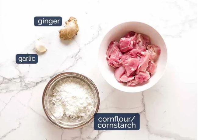 2. Crispy Chicken – tossed in cornflour/cornstarch then fried in as little or as much oil as you want. No, you don’t need to deep fry for this dish; and