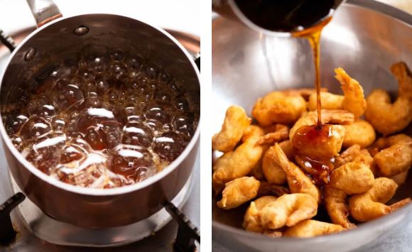 No water added! – Most Honey Prawn sauce recipes include water and cornflour/cornstarch for thickening. Crispy batters and water are not friends! Give the water a miss.