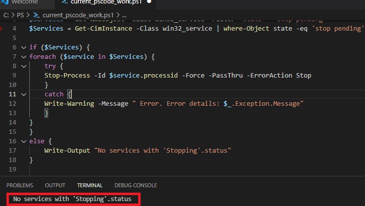 Write-Output "No services with 'Stopping'.status"